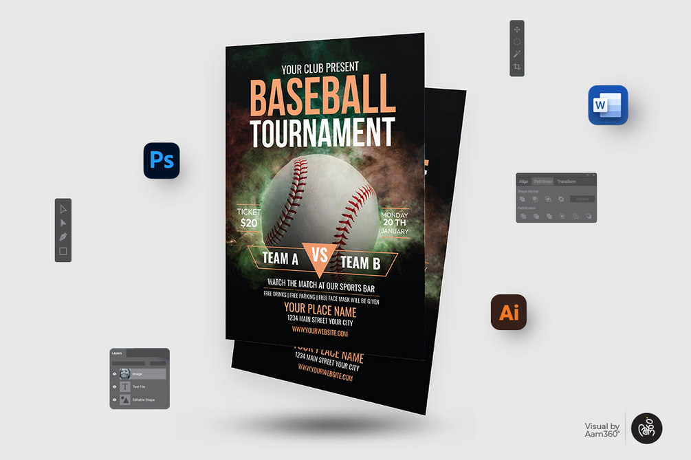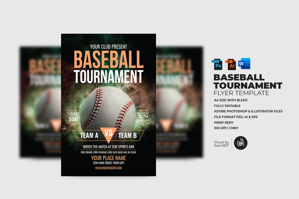 This is a Baseball Tournament Flyer Template, baseball camp, baseball night, sports flyer, baseball game flyer, baseball tryouts, Professional Service or any other purpose.